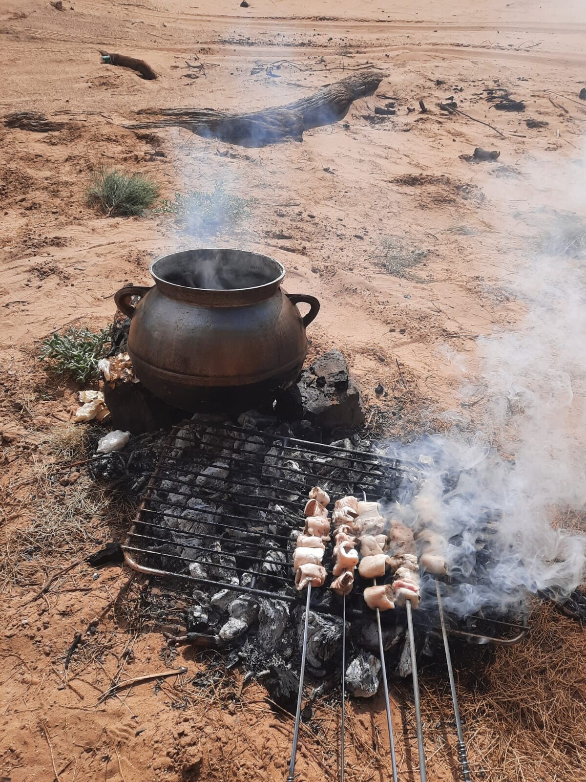Noche en campamento sencillo en el desierto, cena y hoguera bajo las estrellas.